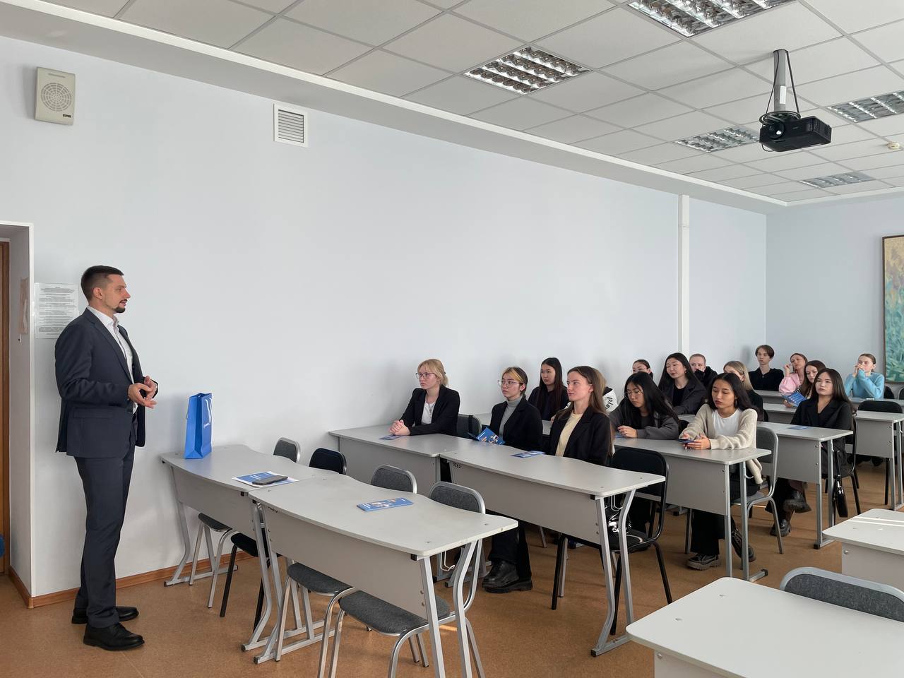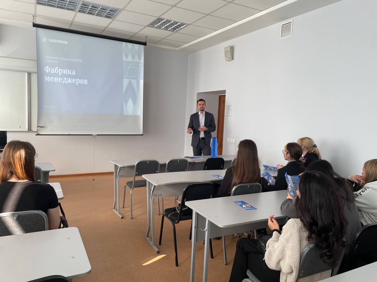 Роман Игоревич Натыкач - начальник отдела продаж зарплатных проектов Омской дирекции по развитию бизнеса Филиала «Западно-Сибирский» АО Газпромбанк рассказал студентам выпускных курсов об истории банка, о нововведениях в офисах, а также раскрыл некоторые секреты профессионального успеха.