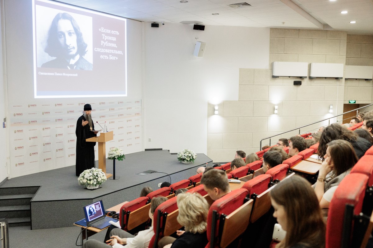 В Президентской академии (РАНХиГС) в рамках проекта «Диалоги» состоялась ежегодная открытая лекция наместника Свято-Троицкой Сергиевой лавры, ректора Московской духовной академии, президента Научно-образовательной теологической ассоциации (НОТА), доктора богословия, епископа Сергиево-Посадского и Дмитровского Кирилла на тему «ДНК России: шедевры преподобного Андрея Рублева».