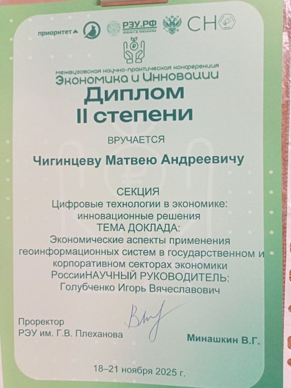 На площадке РЭУ им. Плеханова прошла межвузовская научно-практическая конференция «Экономика и инновации». В секции по цифровым технологиям в экономике победил студент Института государственной службы и управления (ИГСУ) Президентской академии (РАНХиГС) Матвей Чигинцев с докладом «Экономические аспекты применения геоинформационных систем в государственном и корпоративном секторах экономики». Научный руководитель работы – доцент ИГСУ Игорь Голубченко.